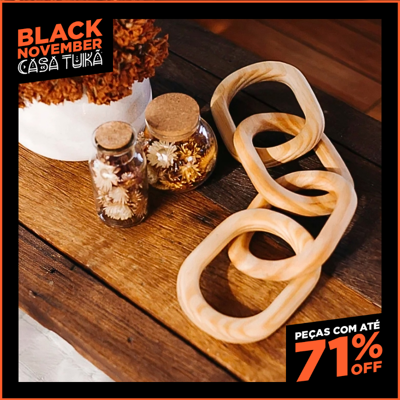 Adicione um toque de charme, personalidade e design contemporâneo ao seu ambiente com a Corrente Decorativa de 4 Elos da Casa Tukã. Esta peça exclusiva e original é feita artesanalmente com muito amor e dedicação, utilizando madeira de reflorestamento, um material que não contribui para a devastação de recursos naturais. Perfeita para ser usada como objeto decorativo sobre mesas de centro, aparadores, estantes ou em bandejas, trazendo textura e um ponto de interesse visual. Disponível nas opções Clara e Escura para combinar com diferentes estilos. Uma marca que valoriza o artesanato, a cultura e o meio ambiente. Especificações: Produto: Corrente Decorativa / Objeto Decorativo de Mesa Composição: 4 Elos interligados Material: Madeira de Reflorestamento Dimensões Aprox. Totais: Comprimento: 50 cm; Altura Elo: 2,2 cm; Largura/Profundidade Elo: 12 cm (pode variar) Detalhes: Artesanal, Exclusiva Casa Tukã, Sustentável. Estilo: Rústico, Moderno, Boho, Natural, Artesanal