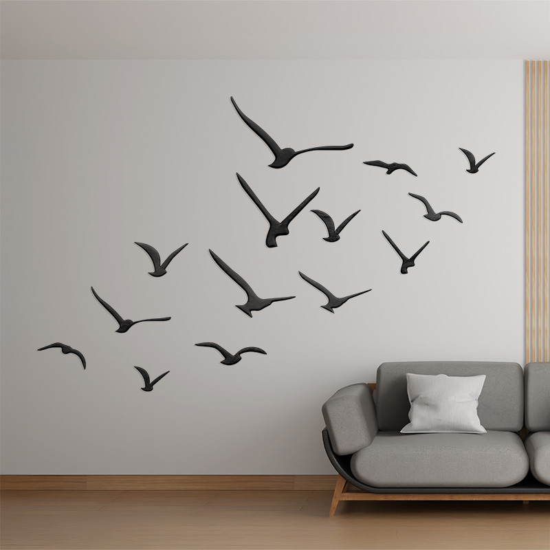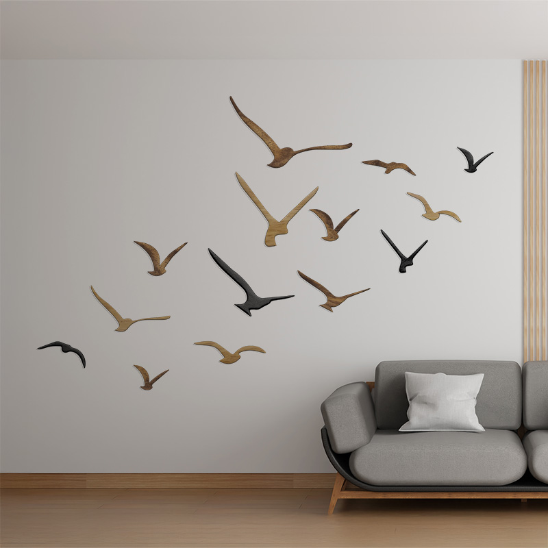 Dispostas na parede, as esculturas formam uma revoada em movimento, criando uma composição leve e dinâmica. A sensação é de liberdade e fluidez, como se os pássaros estivessem atravessando o ambiente em pleno voo.