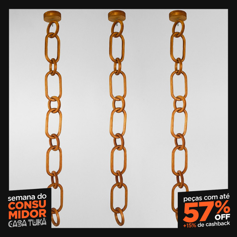 Crie um ambiente de requinte incomparável com o Kit de 3 Correntes Decorativas de Teto da Casa Tukã. Cada corrente é uma expressão de sofisticação, feita artesanalmente em madeira para aprimorar seus espaços. Compostas por elos de design único e um suporte de fixação, cada peça (1,80m de altura) exala luxo. Disponíveis em verniz Imbuia, Claro ou Ipê, são ideais para ambientes finos e requintados. Acompanham parafusos para fixação.