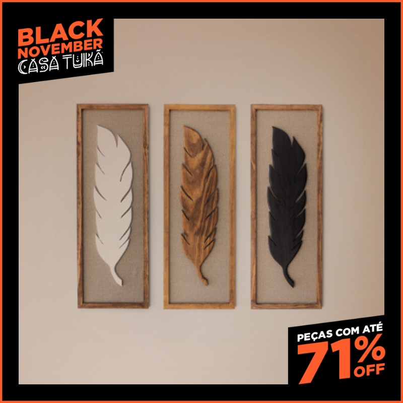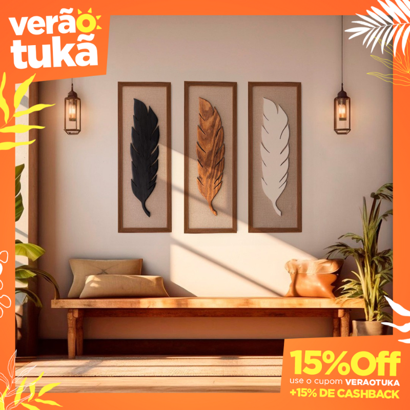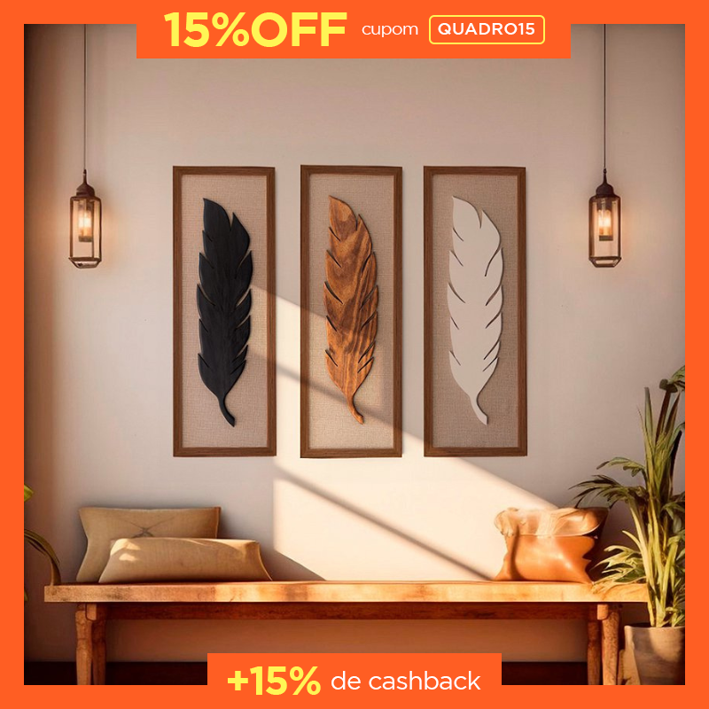 Feito artesanalmente no Brasil, cada quadro de pena (medindo 100cm x 35cm) é emoldurado individualmente em madeira de qualidade, sobre um fundo neutro que realça a peça principal. Ideal para a sala de estar, quarto ou escritório, este conjunto vai além de um simples objeto decorativo; ele cria um ambiente acolhedor e tranquilo, refletindo as tendências de design biofílico e a valorização do trabalho manual cuidadoso.