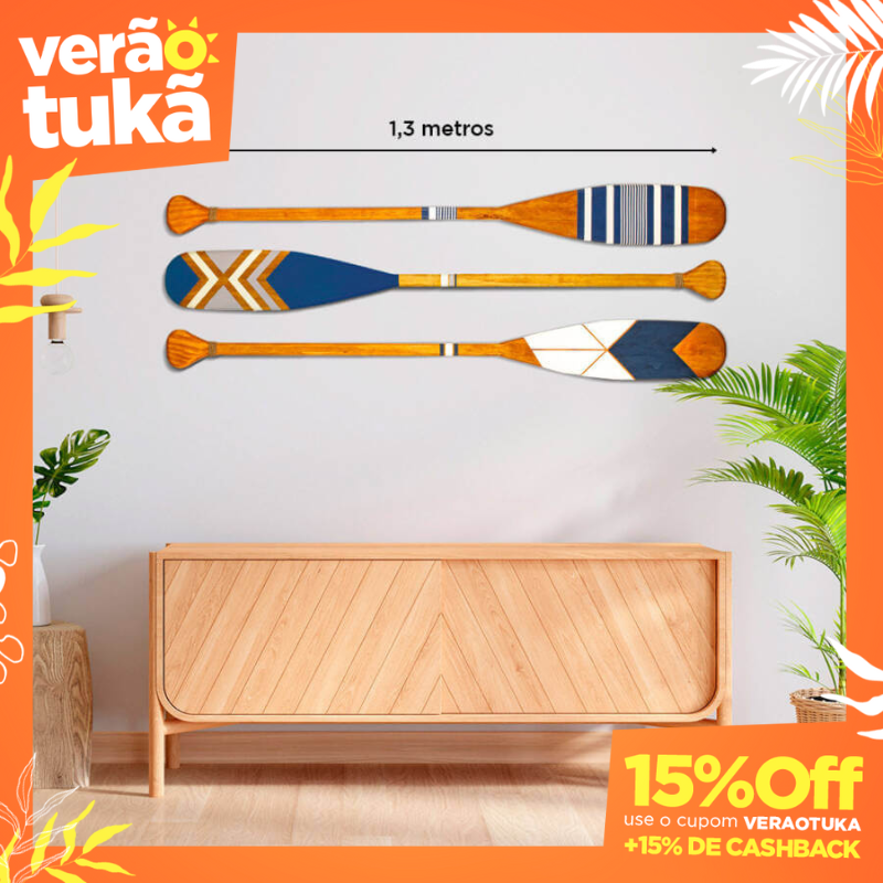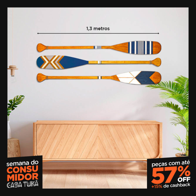 Decore com uma composição harmoniosa usando o Kit de 3 Remos Decorativos Canadenses da Casa Tukã, com as pinturas C2, C6 e C8. Feitos artesanalmente em madeiras naturais com design e pintura originais, são perfeitos para adicionar um toque rústico-moderno e a sensação de tranquilidade ao seu ambiente. Ideal para paredes de salas, quartos ou casas de praia. Podem ser pendurados (ganchos triangulares inclusos) ou apoiados. Disponíveis em vários tamanhos.