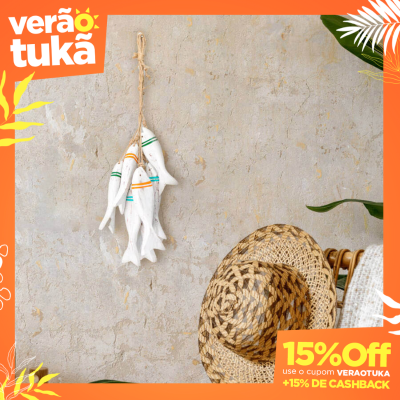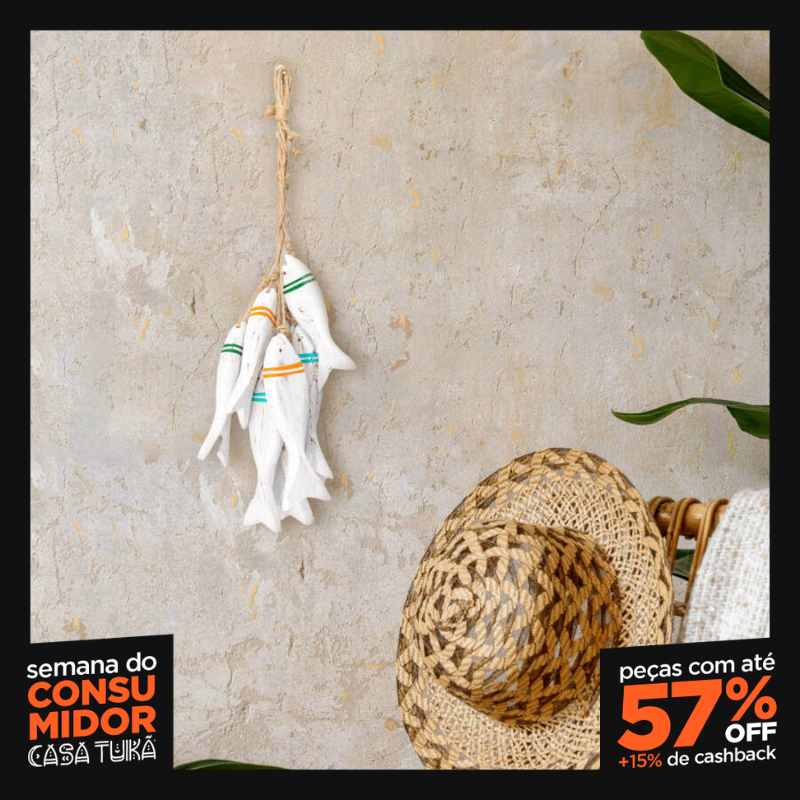 Crie um cardume charmoso na sua parede com a Penca Decorativa de 6 Peixes da Casa Tukã. Com design e pintura originais, cada peça é feita de madeiras naturais, modelada e esculpida através de artesãos que dominam a arte milenar da marchetaria e a pintura manual. Este enfeite pendente traz a sensação de tranquilidade do mar para qualquer ambiente, como salas, quartos, varandas, escritórios ou casas de praia. O processo produtivo é 100% feito à mão, garantindo a exclusividade e o carinho em cada detalhe. Disponível em diversas cores.